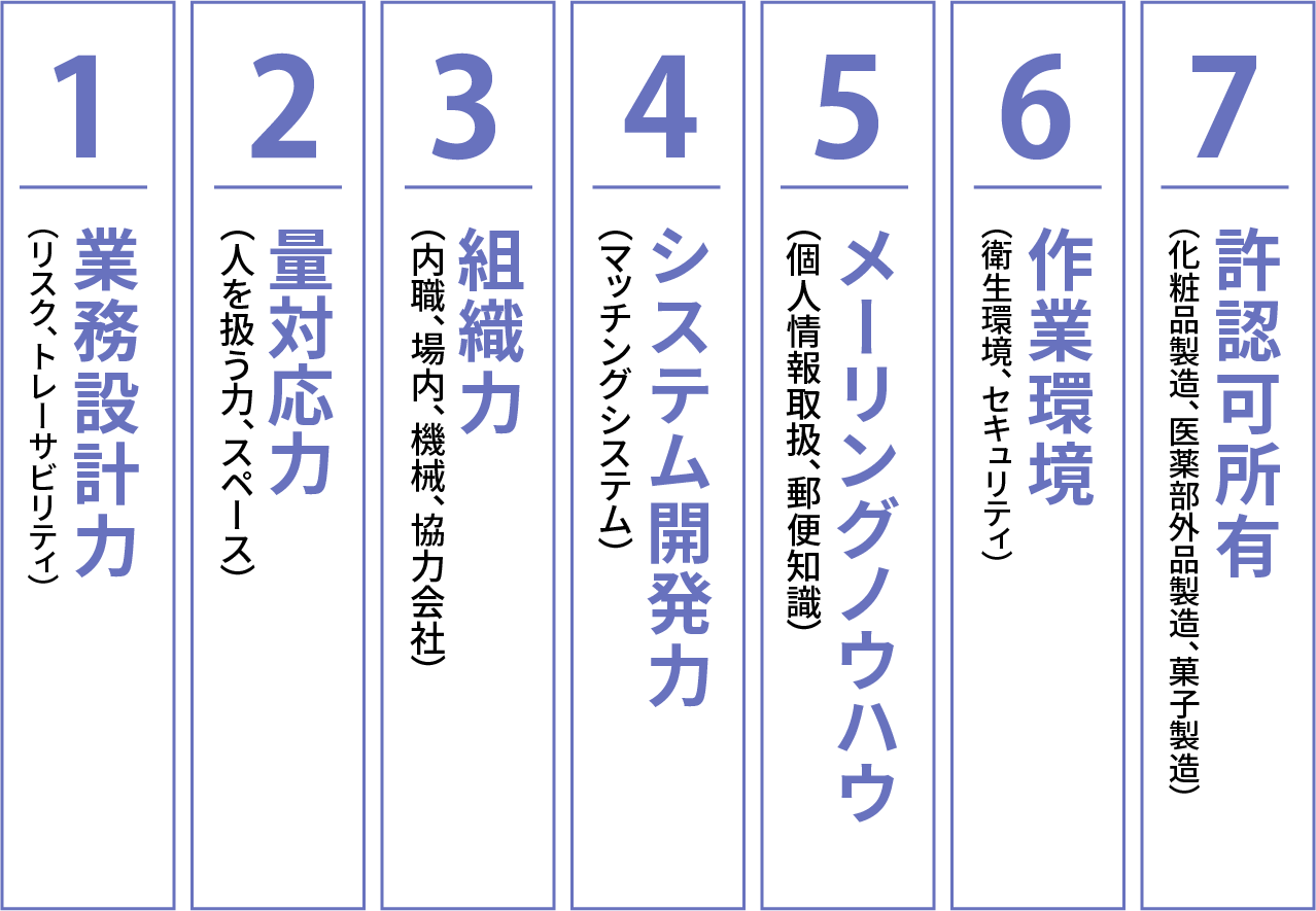 豊富な人財を活かす施設とベネッセ事業で培った検査工程により、機械化できない仕様やロットのDMへの対応、高水準の個人情報セキュリティとトレーサビリティを保つシステムを提供しています。
